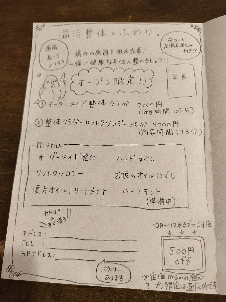 ご近所に100枚くらいチラシを配ろうかな…と、たたき台を作成中。今こそ美術4だったり5だったりの実力を発揮する時!内容はこんなものかな。 これを丁寧に綺麗に作って、10月に入ったらこっそり配りに行こう。
