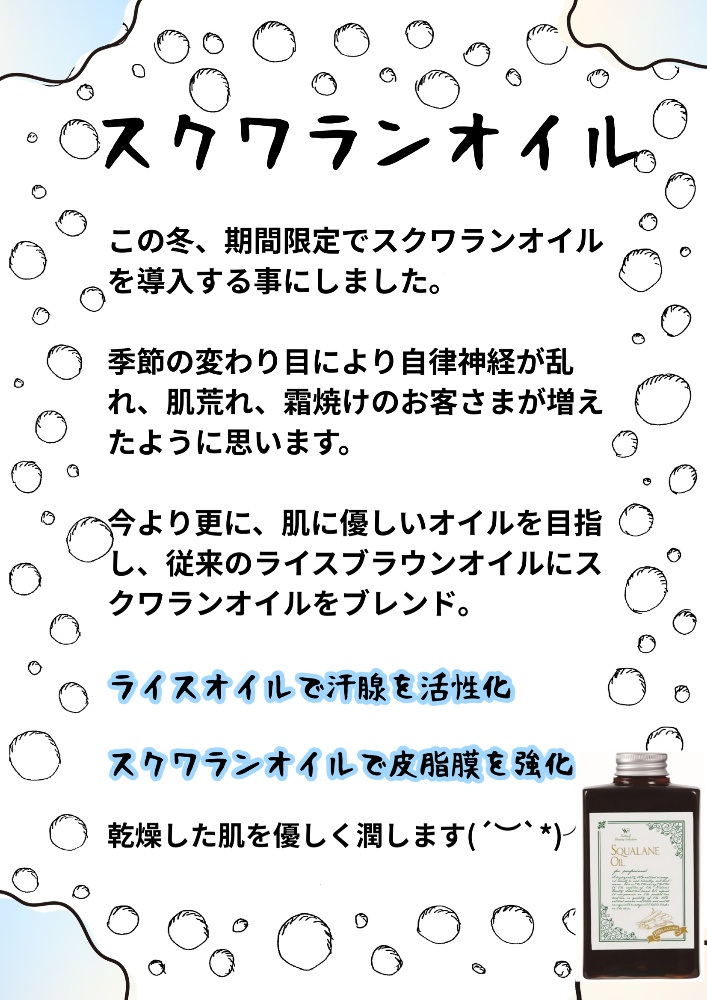 この冬、普段使っているライスオイルに植物性のスクワランオイルをブレンドし、よりお肌に優しいオイルにしました。
